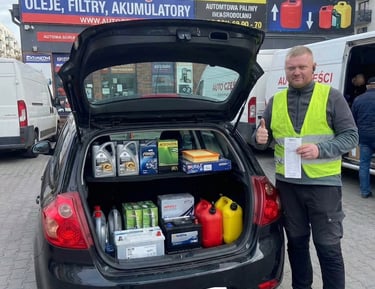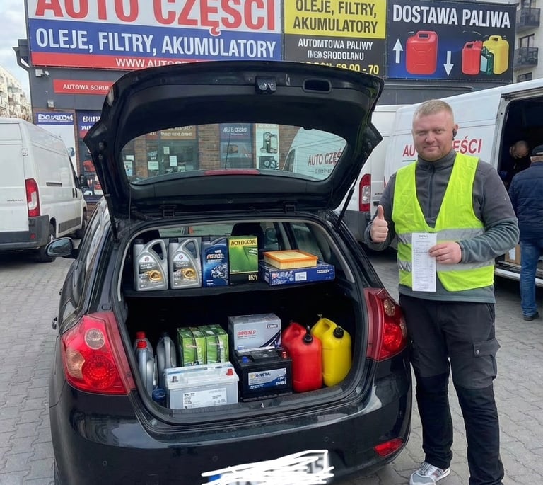 Zakup i dowóz części samochodowych (oleje, filtry, akumulatory) oraz dostawa paliwa pod wskazany adres lub dokładne współrzędne (np. przy awarii na drodze)